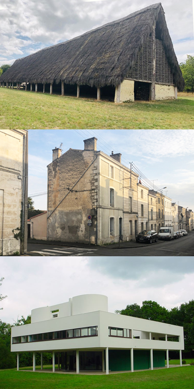 3 maisons à 3 époques différentes : vers – 5 000 ans environ, fin XIXe siècle et 1930. (1-2) © CAUE 79 / (3) CC, architecte Le Corbusier