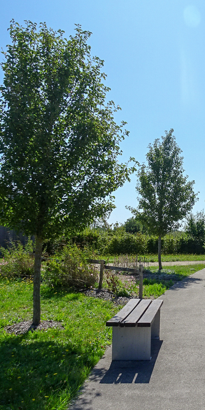 La conception du quartier s’appuie sur un important réseau d’espaces naturels : des bosquets sur des noues vouées à la régulation des eaux pluviales, des haies bocagères existantes et nouvelles comme brise-vent, des haies taillées en guise de clôture à l’avant des parcelles et des haies fleuries en accompagnement des cheminements piétons. La plupart des voies du quartier sont accompagnées de bandes enherbées, renforçant l’image verdoyante en cohérence avec la campagne environnante.